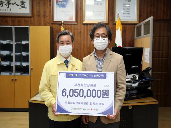 국립해양생물자원관(관장 황선도)은 3일 지역 내 취약계층에 전달해 달라며 직원들이 십시일반 성금을 모아 구입한 서천사랑상품권 605만 원을 서천군에 기탁했다.