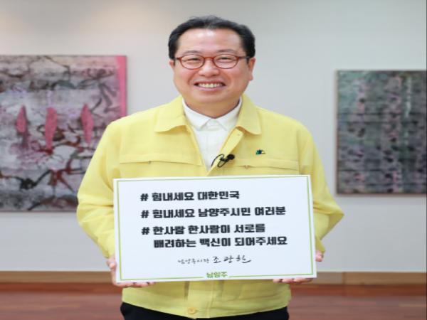 경기 남양주 조광한 시장이 지난달 27일에 이어 3일‘희망 캠페인’ 릴레이 주자로 다시 한 번 참여해 코로나19로 어려움을 겪고 있는 대한민국 국민과 남양주 시민에게 희망과 응원의 메시지를 전달했다.