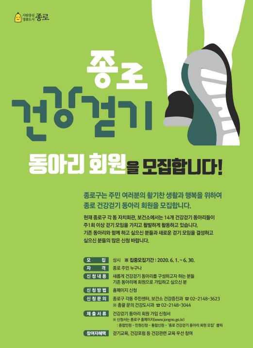 현재 관내 각 동 자치회관과 보건소에는 총 14개의 건강걷기 동아리가 주1회 이상 걷기 모임을 갖고 활발하게 활동 중이다. 종로구는 이번 신규 회원 모집을 통해 코로나19 장기화로 심신이 지쳐 있는 주민들이 걷기 운동을 즐기며 활력을 되찾고 이웃과 소통하면서 행복하고 활기찬 삶을 추구할 수 있도록 돕고자 한다.
