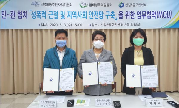 영등포구(구청장 채현일) 신길6동주민센터는 신길6동주민자치위원회, 꿈터성폭력상담소와 함께 ‘성폭력 근절 및 지역사회 안전망 구축’을 위한 업무 협약(MOU)을 체결했다.
