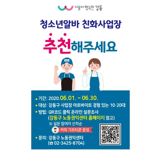 아르바이트로 처음 사회활동을 시작하는 청소년은 부당하게 연장근로를 하거나 근로계약서를 작성하지 않는 등 청소년의 노동인권이 지켜지지 않는 사례가 종종 있다. 이에 강동구(구청장 이정훈)가 청소년의 노동인권을 보호하고자 올해부터 강동구 청소년알바친화사업장 인증사업을 시작한다.