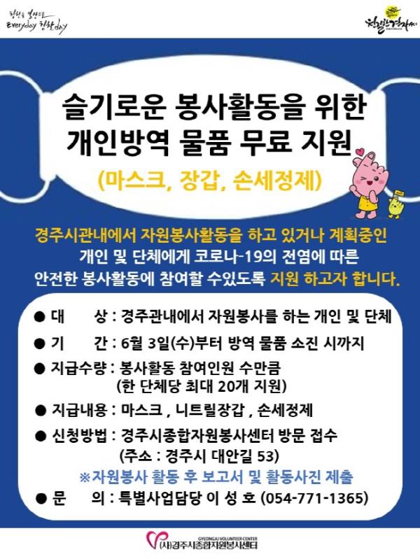 지원대상은 경주시 관내에서 활동하는 자원봉사자 및 단체이며, 자원봉사활동에 참여하는 경주시민을 위해 마스크, 장갑, 손세정제를 단체 당 최대 20개까지 지원하며, 자원봉사센터에 방문해 신청서 작성 후 지원받을 수 있다.
