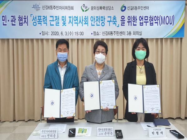 영등포구(구청장 채현일) 신길6동주민센터는 신길6동주민자치위원회, 꿈터성폭력상담소와 함께 ‘성폭력 근절 및 지역사회 안전망 구축’을 위한 업무 협약(MOU)을 체결했다.