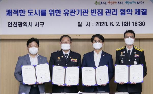 인천 서구(구청장 이재현)는 인천서부경찰서, 인천서부소방서, 인천서구 지역자활센터와 함께 지난 2일 효율적인 빈집관리를 위한 업무협약을 체결했다고 밝혔다.