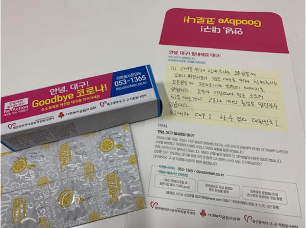 대구시자원봉사센터는 지난 5월 대한주택관리사협회 대구시회와 연계해 용계동 강변동서마을아파트, 각산동 혁신LH천년나무3단지아파트, 율하동 경남모직안아주아파트 주민 600여명의 자발적 참여로 안부메시지를 담은 손편지와 휴대용 손소독제, 비타민제를 이웃에 전달하는 자원봉사활동을 펼쳤다.