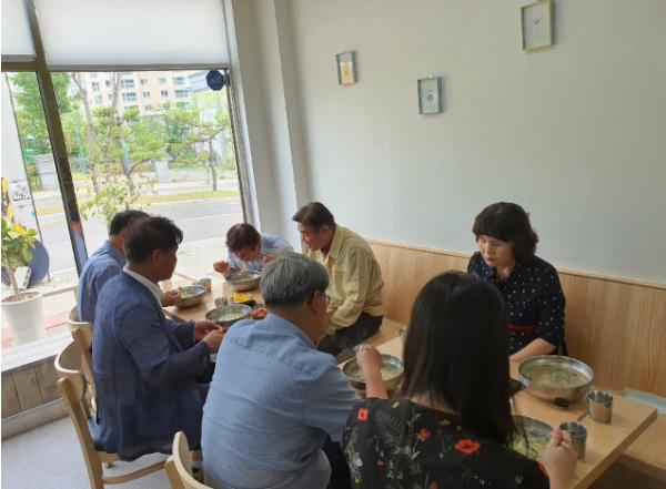 김일권 양산시장은 5일 웅상출장소 총무과 직원들 20여명과 함께 양산시 주진동 소재 ‘오늘은 칼국수’ 식당을 방문해 점심을 하면서 그동안 코로나19 지원으로 인한 직원들의 노고를 격려하는 시간을 가졌다.