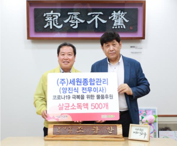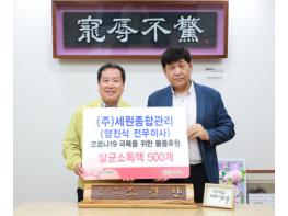 남양주시(시장 조광한)는 5일 시장집무실에서 ㈜세원종합관리(회장 정화찬)에서 코로나19 극복을 위한 살균소독액 500통을 경기사회복지공동모금회에 기증하는 전달식을 가졌다.