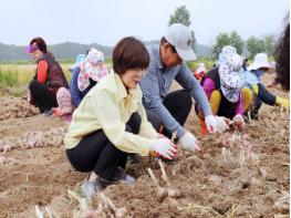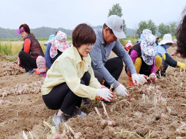 김보라 안성시장은 지난 5일, 양성면 필산리에 위치한 농가에서 양성농협, 경기신용보증재단, KEB하나은행 임직원들과 함께 마늘 수확 일손돕기를 진행했다.