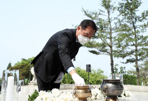 오전 9시부터 12시까지 보훈가족 및 시민들은 현충탑을 방문, 생활 속 거리두기를 실천하며 자율적으로 참배했으며, 선열들의 숭고한 희생과 헌신을 되새기는 시간을 가졌다.