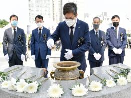 염태영 수원시장이 6일 수원현충탑에서 열린 제65회 현충일 추념식에서 분향하고 있다. 수원시와 경기도가 공동주관한 이날 제65회 현충일 추념식은 순국선열과 호국영령에 대한 묵념으로 시작해 국민의례, 헌화·분향 ‘현충의 노래’ 제창으로 이어졌다.