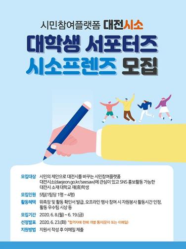 대학생 서포터즈 ‘시소프렌즈’는 개인 소셜네트워크서비스(SNS) 활용에 능숙한 대전시 소재 대학 재(휴)학생이라면 누구나 참여 가능하며, 4명 이하의 팀을 구성해 6월 19일까지 접수하면 된다.