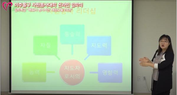 강사로 나선 박수정 에듀플랜 대표의 ‘골목골목 행복한 공동체를 만들기 위한 자원봉사대학’이란 입학 특강과 자원봉사대학 운영 안내 등은 미추홀구 미디어 영상팀 협조로 사전 촬영해 온라인으로 제공됐다.