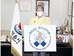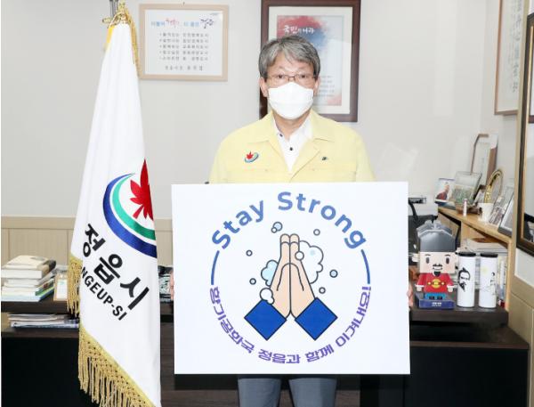 정읍시 유진섭 시장이 지난 5일 코로나19 극복을 위해 ‘향기공화국 정읍과 함께 이겨내요’라는 문구가 담긴 팻말을 들고 ‘스테이 스트롱(Stay Strong) 캠페인’에 동참했다.