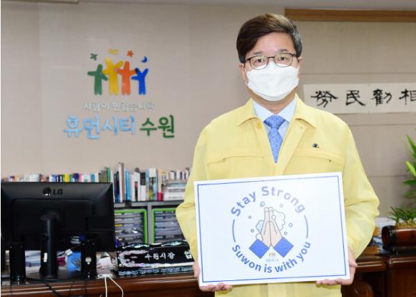 염태영 시장은 ‘Stay Strong, Suwon is with you’라는 문구가 적힌 손 팻말을 들고 캠페인에 참여했다. 손팻말에는 기도하는 두 손 위에 거품이 있는 그림이 있는데, 이는 개인위생을 철저하게 관리해 코로나19를 이겨내자는 의미다.