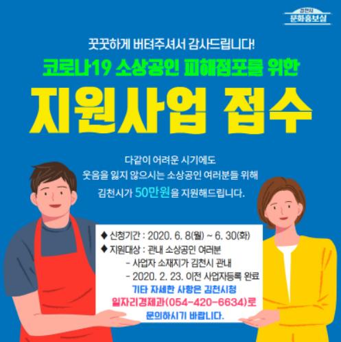 김천시(시장 김충섭)은 김천시 관내에 사업장을 둔 소상공인에게 일괄 50만원을 지급하는「코로나19 소상공인 피해점포 지원사업」을 6월 8일부터 6월 30일까지 신청받는다고 밝혔다.