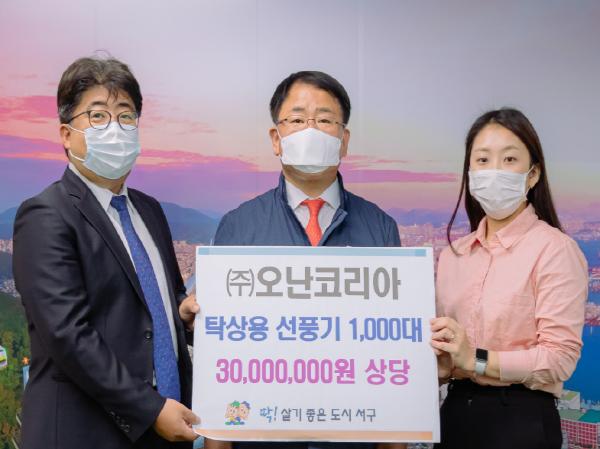 부산 해운대구 소재 ㈜오난코리아(대표 진중헌)는 지난 8일, 저소득 아동에게 전해달라며 탁상용 선풍기 1,000대(3,000만 원 상당)를 서구(구청장 공한수)에 기탁하였다.