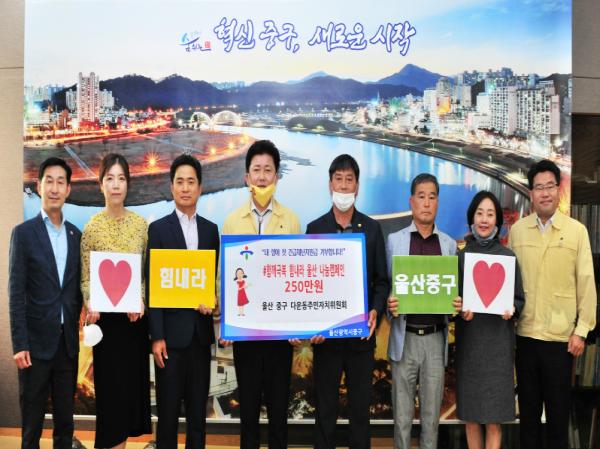 울산 중구 다운동 주민자치위원회(위원장 정성일)가 정부가 지급하는 ‘긴급재난지원금’을 십시일반 모금해 현금으로 기부했다.