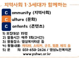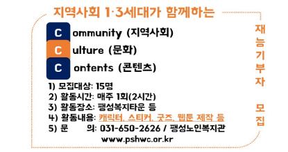 평택복지재단(이사장 김준경) 산하 팽성노인복지관(관장 김동석)은 노인 인식개선사업 ‘C·C·C’ 재능기부자를 모집한다. 본 사업은 경기도 사회복지공동모금회 지원을 받는 사업으로 2020년 한 해 동안 진행될 예정이다.