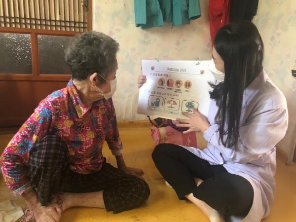 김천시보건소(중앙보건지소) 방문건강관리팀에서는 올 초 코로나 19로 대상자들에게 직접 방문을 중단하였다가 지난 6월 1일부터 서서히 직접 방문을 재개하였다. 아직 예년처럼 활발하게 방문활동을 전개 할 수 없어 아쉬움이 있다. 하지만 취약계층을 방문하여 여름철 건강관리를 위해 수분섭취의 중요성, 냉방 기기의 사용 요령, 폭염 주의보?경보 등 발생 시 외부활동 자제 및 휴식, 외부 활동 시 차광모자 이용, 탈수 등 증상 발현 시 대처 요령, 119 비상연락 등 교육을 하고 있고 특히 고령자 및 기저질환자에 대한 건강관리에 더욱 집중하고 있으며 특히 코로나19와 관련해서 올바른 손 씻기, 기침 예절, 마스크의 정확한 착용 방법 및 주의사항, 사회적 거리두기 등 대응교육을 매 방문 시마다 반복적으로 실시해 경각심을 유지하도록 하고 있다.
