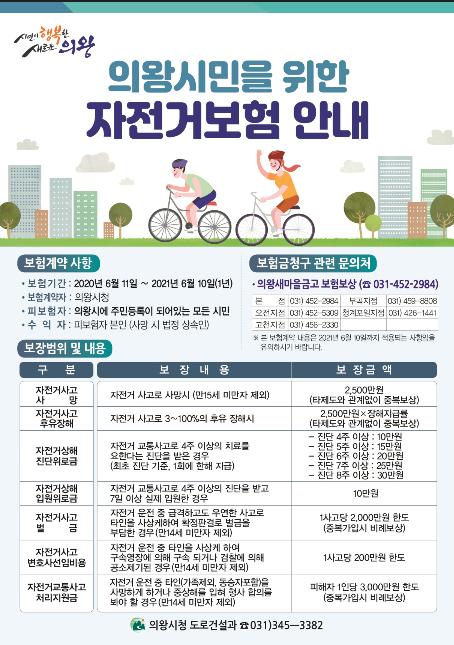 의왕시에 주소를 두고 거주하고 있는 모든 시민은 전국 어디서나 자전거로 인한 사고가 발생했을 때 보험혜택을 받을 수 있으며 보험기간은 이달 11일부터 2021년 6월 10일까지이다.