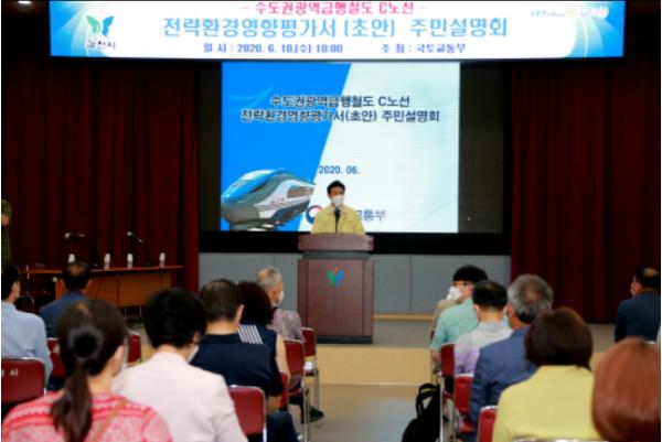 과천시 김종천 시장이 10일 과천시청 대강당에서 열린 국토교통부 주관 수도권광역급행철도 GTX-C노선 전략환경영향평가서에 대한 주민설명회에 참석해, 해당 사업이 원안대로 조속히 추진돼야 한다고 다시 한번 강조했다.