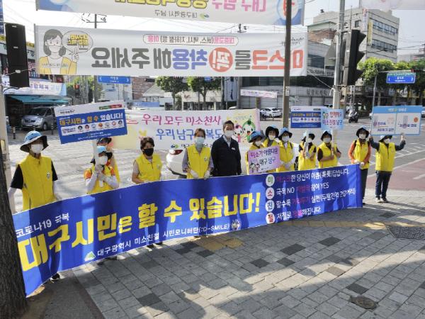 대구광역시 남구청(구청장 조재구)은 미소친절 시민모니터단 남구지회(회장 장재선)에서 지난 9일 코로나19 극복을 위한 생활 속 거리두기 확산 및 미소친절 홍보 캠페인을 펼쳤다고 밝혔다.