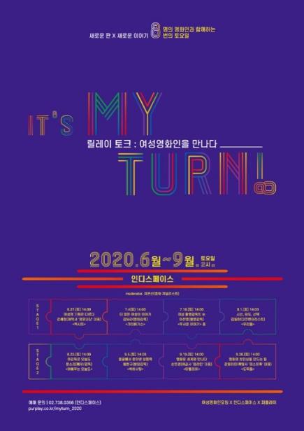 여성영화인모임, 인디스페이스, 퍼플레이가 공동 기획한 'It's MY turn! 릴레이 토크 : 여성영화인을 만나다'(이하 ‘It's MY turn!’)가 2020년 6월부터 9월까지 총 8회, 토요일 2시에 인디스페이스에서 열린다.