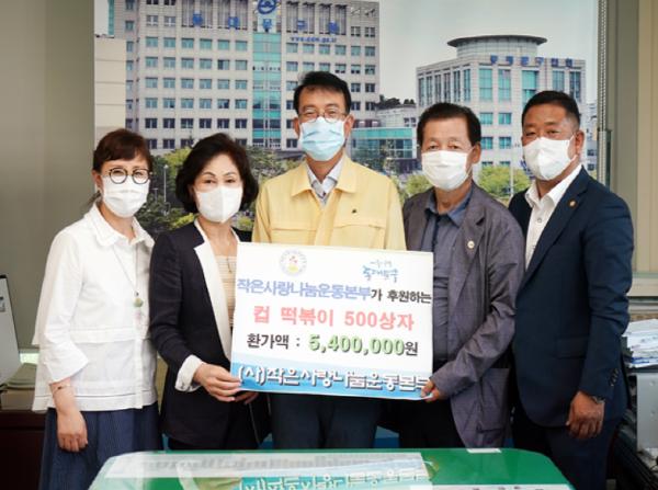 이날 (사)작은사랑나눔 운동본부는 컵 떡볶이 3,000개(환가액 540만 원 상당)를, 한국주택금융공사 서울동부지사는 성금 200만 원을 전달했다.