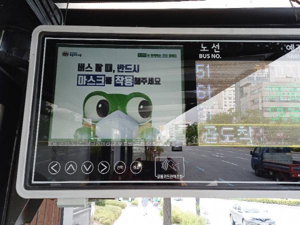 6월 초부터 모든 시내버스와 택시에 ‘버스(택시) 탈 때, 반드시 마스크를 착용해 주세요’라는 문구가 담긴 홍보 스티커를 부착해 이용자들의 자발적인 마스크 착용을 유도하고 있다. 정부는 지난 5월 26일부터 대중교통(버스, 택시, 도시철도 등) 이용자의 마스크 착용을 의무화했다.