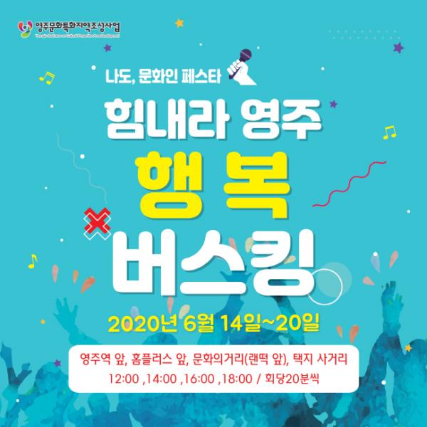 (재)영주문화관광재단(이사장 장욱현)에서는 6월 14일(일)부터 20일(토)까지 7일간 영주 도심내에서 「힘내라 영주! 행복 버스킹」 행사가 진행된다고 밝혔다.