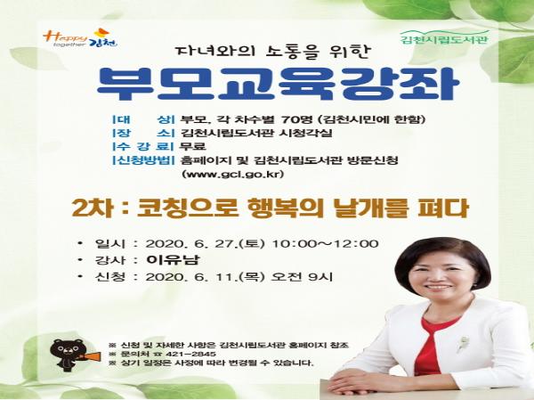 제2차 부모교육 강좌는 ‘엄마 반성문’의 저자이자, 서울 영문초등학교 이유남 교장 선생님을 초빙하여 “코칭으로 행복의 날개를 펴다.”를 주제로 진행한다. 이유남 교장은 자녀를 위한 감정 코칭의 성공사례를 자녀 양육의 실제 경험을 토대로 깊이 있는 강연을 펼칠 예정이다. 또한, 감정코칭의 성공사례와 대화법의 실제사례를 중심으로 현실적 교육 방안을 제시 해줄 것으로 기대한다.