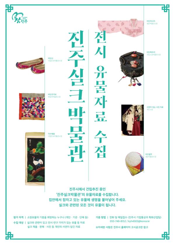 진주시는 진주실크박물관 건립을 위해 실크와 관련된 각종 유물 자료를 수집한다고 밝혔다. 수집 대상은 실크와 관련이 있고 전시, 연구 가치가 있는 유물이나 실크공예품, 한복, 사진 등 개인의 사연이 담긴 자료이다.