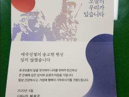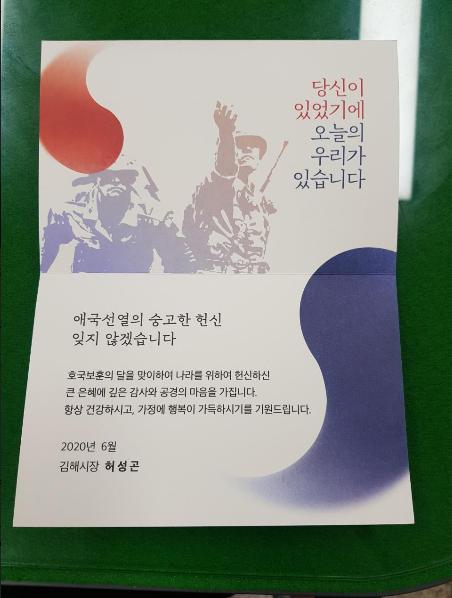 김해시(시장 허성곤)는 6월 호국보훈의 달을 맞아 나라를 위해 희생한 국가유공자와 유족 4,992명에게 감사의 마음을 담은 감사카드를 전달했다고 밝혔다.
