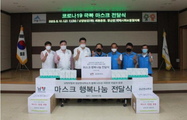 세종특별자치시 장군면에 위치한 남양유업 세종공장이 지난 12일 감염병 취약계층을 위해 마스크 1만 장을 장군면 지역사회보장협의체에 기탁했다.