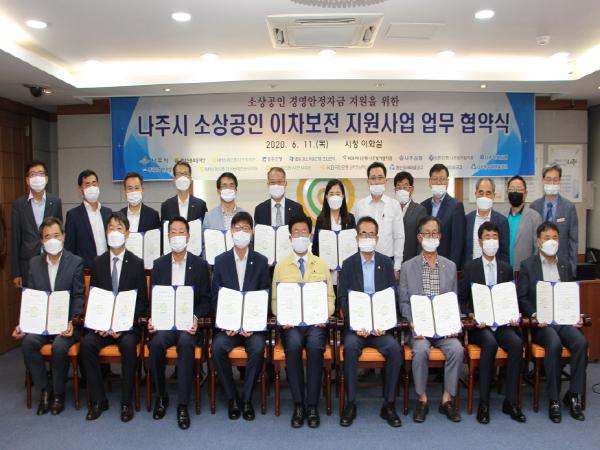 전라남도 나주시(시장 강인규)는 지난 11일 시청 이화실에서 소상공인 경영안정자금 지원을 위한 14개 금융기관, 전남신용보증재단과의 ‘이차보전 지원 업무 협약식’을 가졌다고 밝혔다.