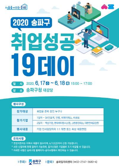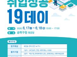 송파구(구청장 박성수)는 오는 17일과 18일 이틀간 오후 3~5시 송파구청 4층 대강당에서 ‘취업성공 일구데이(19-DAY)’를 연다고 14일 밝혔다.