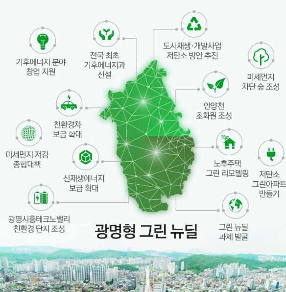 광명시는 정부의 그린뉴딜 정책과 연계한 광명형 그린뉴딜 정책을 통해 모든 분야에서 온실가스를 감축하여 2050년 탄소중립을 달성하고, 지역 내 관련 일자리를 창출하며 각종 불평등을 해소하고 지방정부 차원의 그린뉴딜을 선도해 나갈 계획이다.
