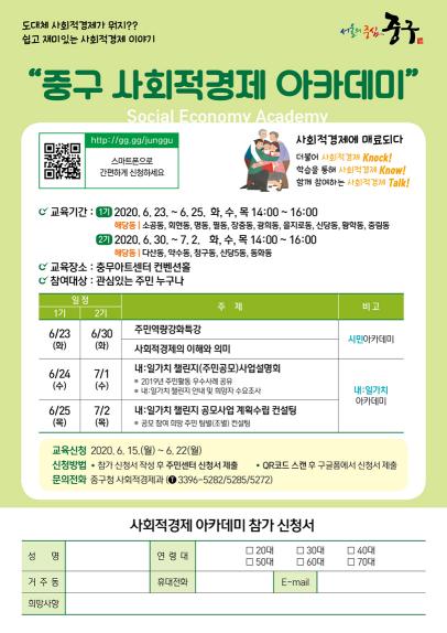 아카데미 참석희망자는 현재 접수 중이며 오는 19일(금)까지 각 기수별 50명씩 선착순 100명을 모집한다. 사회적경제나 중구형 동정부 구현에 관심있는 주민이라면 누구나 환영이다.