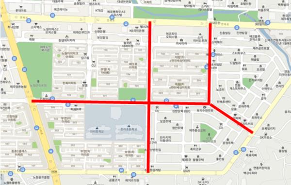 사업대상지는 제주시 노형동 한라초ㆍ중학교 주변 도로 2.0km 가량이다. 대상지 인근에는 학교가 위치해 있고, 아파트가 밀집해 있어 등ㆍ하교 시간대 및 출ㆍ퇴근 시간대에 교통이 혼잡한 지역인 만큼 자전거 사고 위험률이 높다고 판단되어 선정되었다.