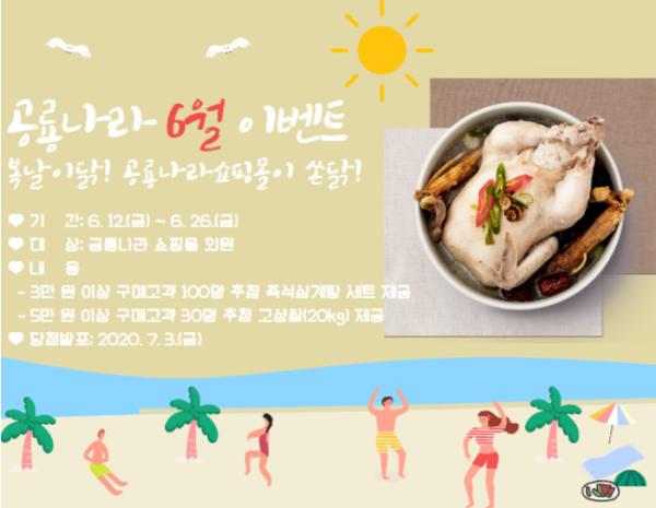 6월 12일부터 26일까지 진행하는 이번 이벤트는 이벤트 기간 중 공룡나라 쇼핑몰 판매상품 3만 원 이상 구매자 100명을 추첨해 복날을 이겨낼 수 있는 즉석 삼계탕 세트를 제공, 5만 원 이상 구매자 30명을 추첨해 고성쌀(20kg)을 제공한다.