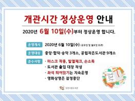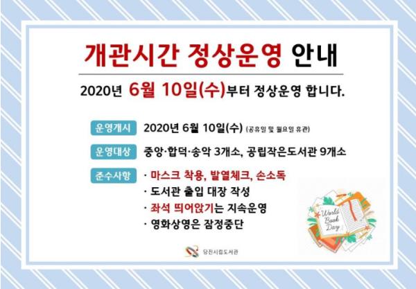 당진시립도서관은 10일부터 공공도서관 3개소(중앙·합덕·송악도서관)와 작은도서관 9개소를 정상 운영한다고 밝혔다.