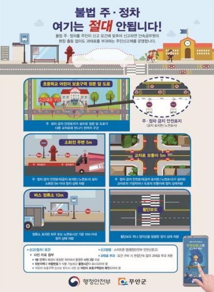 무안군(군수 김산)은 오는 7월 1일부터 불법주정차 주민신고제 대상을 초등학교 앞 어린이보호구역까지 확대한다고 밝혔다.