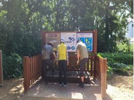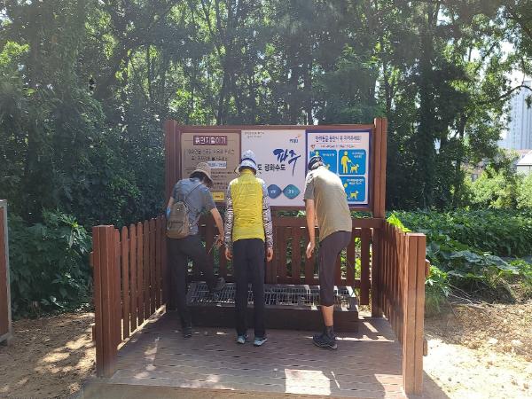 파주시 운정2동은 지난 15일 주민들이 흙과 먼지를 제거할 수 있도록 고인돌 산책로 입구(목동동 산53-21)에 흙먼지털이기를 설치했다.