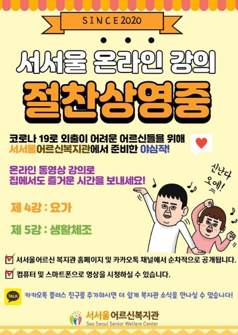 첫째로 지난 3월부터 서서울어르신복지관 공식 사이트에서는 △몸튼튼체조 △ 우쿨렐레 연주 △영어교실 △요가교실 등의 온라인 강좌를 무료로 제공하고 있다. 수강을 원하는 어르신은 서서울어르신복지관 사이트에 접속한 뒤 상단 배너 ‘소통 공간-온라인 강의’를 클릭해 원하는 강좌를 골라 들으면 된다.