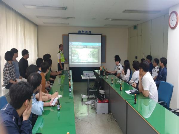합천경찰서(서장 김오녕)는, 2020. 6. 17일 한국전력합천지사 2층 회의실에서 박일섭 지사장 등 약 40여명 대상으로 사람이 보이면 일단멈춤이라는 주제로 교통안전교육을 실시했다.