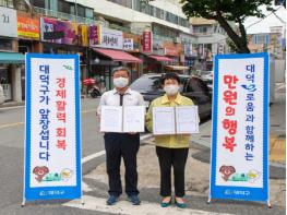 대전 대덕구(구청장 박정현)가 17일 신탄진새시장상가거리에서 코로나19로 인한 경기침체 극복과 소비촉진을 위해 신탄진새시장상가번영회(회장 김광식)와‘대덕e로움과 함께하는 만원의 행복’운영 업무협약을 맺었다.