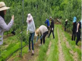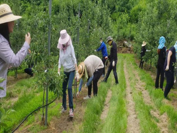 박유동 총장을 비롯한 교직원 20명은 농번기에 코로나19로 인해 일손 부족으로 어려움을 겪고 있을 농가에 실절적인 도움을 주고자 아침 일찍부터 사과열매솎기 작업을 하며 구슬땀을 흘렸다.