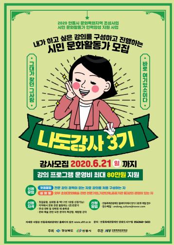 (재)안동축제관광재단은 문화특화지역 조성사업의 일환으로 오는 6월 21일까지 안동 시민들을 대상으로 자신의 재능을 펼칠 수 있는 강의 프로그램을 기획하고 진행하는 ‘나도 강사’3기 시민 강사를 모집한다.