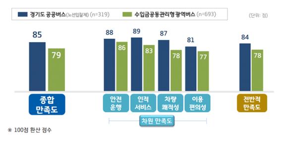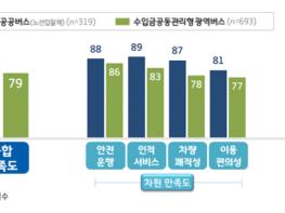 조사결과 ‘경기도 공공버스’는 85점으로 ‘매우 만족’ 수준이었으며 ‘수입금공동관리형 준공영제’는 79점으로 ‘다소 만족’인 것으로 나타났다.
