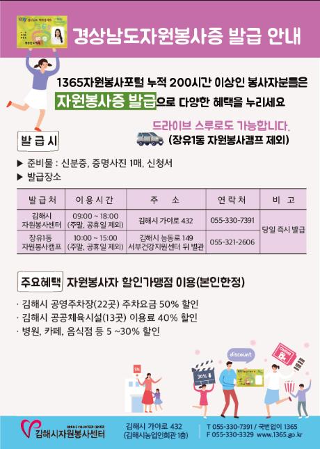 자원봉사1365포털에 가입한 자원봉사자 중 봉사활동 200시간 이상인 시민은 경상남도자원봉사증을 발급받을 수 있으며 증 소지자는 5월말 기준 센터에 등록된 관내 213개 할인가맹점 이용 시 5~30%의 할인혜택을 받을 수 있다.
